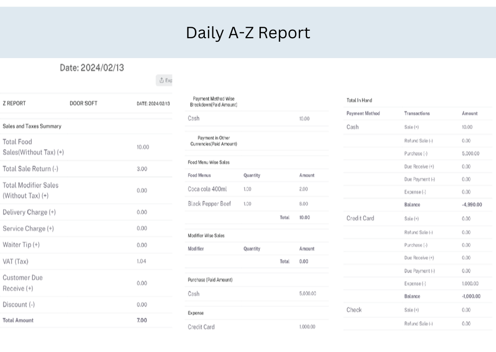 - Daily A-Z Report, Item Analysis Report, Profit/Loss Analysis